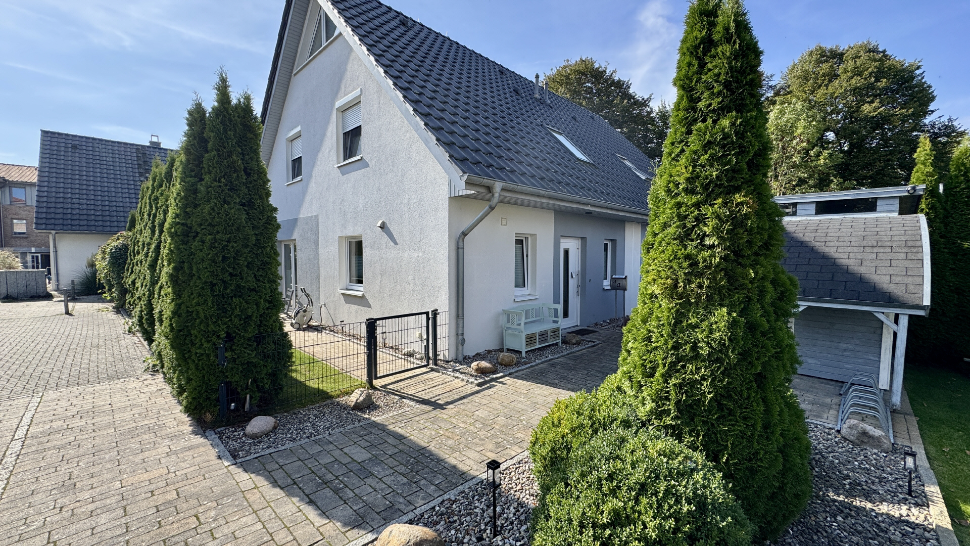 Außenbereich: umzäunter Garten, 2 Terrassen, Gartenhaus und 2 PKW-Stellplätze